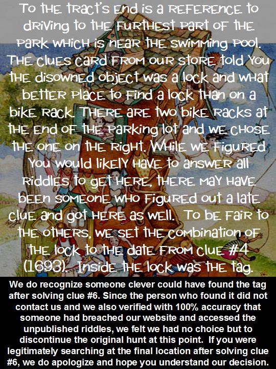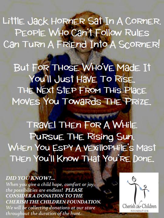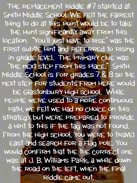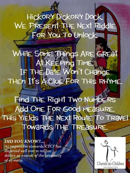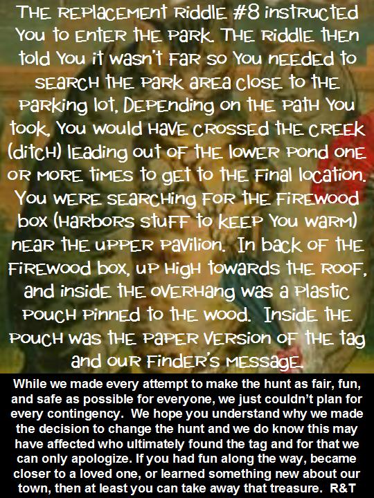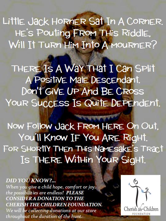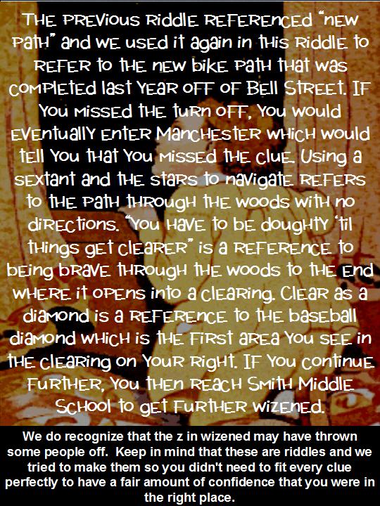 Click HERE to "Like Us" on Facebook for extra hints, notification when the riddles are posted, and to monitor progress of the hunt.