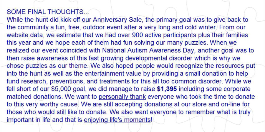 is based on puzzles and was chosen, in part, to help raise awareness of autism, a complex developmental disability that typically appears during the first three years of life and affects a person’s ability to communicate and interact with others. Often, autism is represented by a puzzle piece which depicts the ambiguity and mystery around the causes and understanding of autism. The hunt also coincides with National Autism Awareness Month and World Autism Awareness Day on April 2.