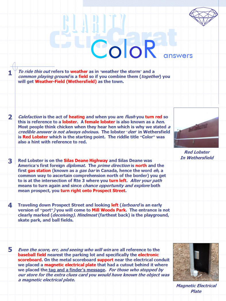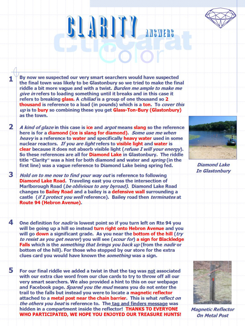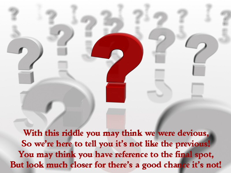 - the entire riddle, containing five stanzas with each stanza being a separate riddle, will be released at once on our Facebook page and hunt web page (riddle links to the right will become active),