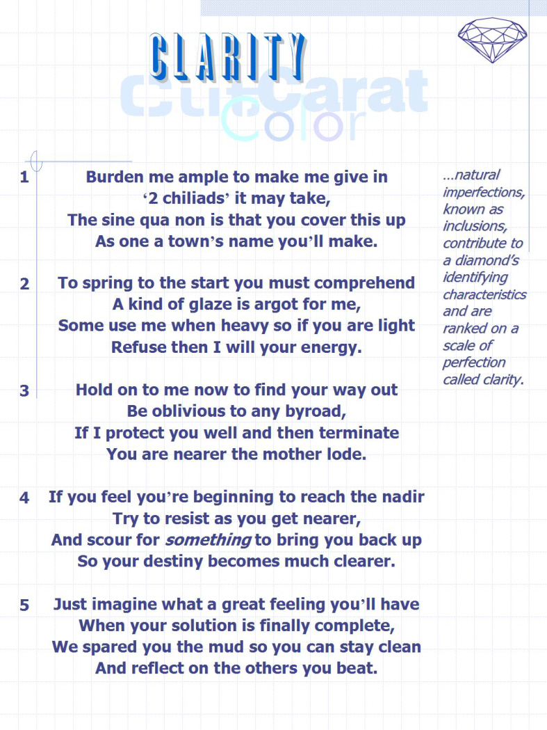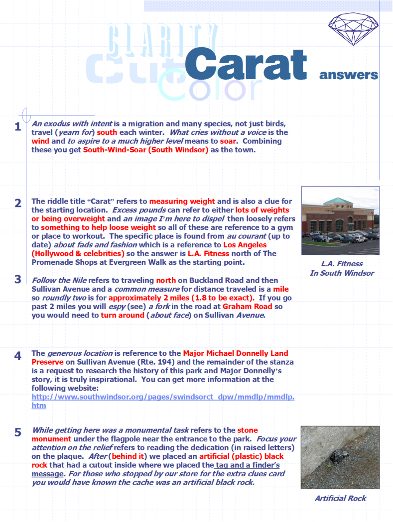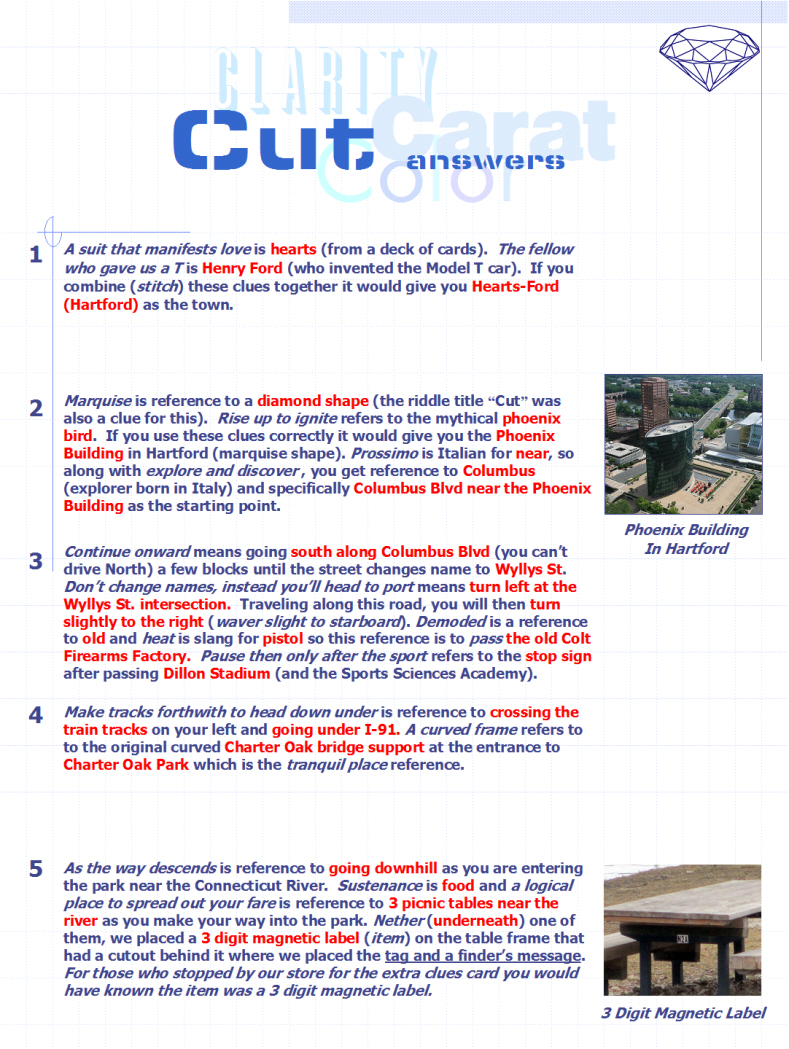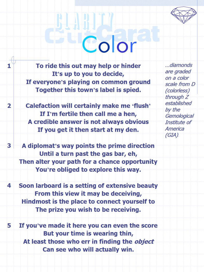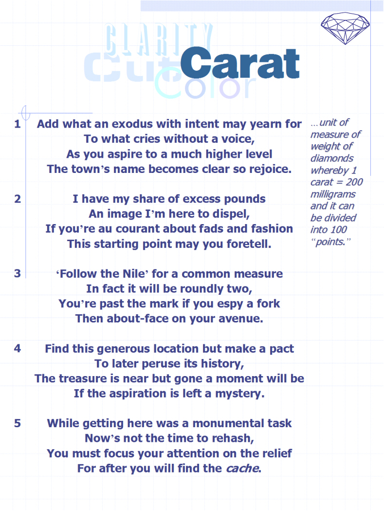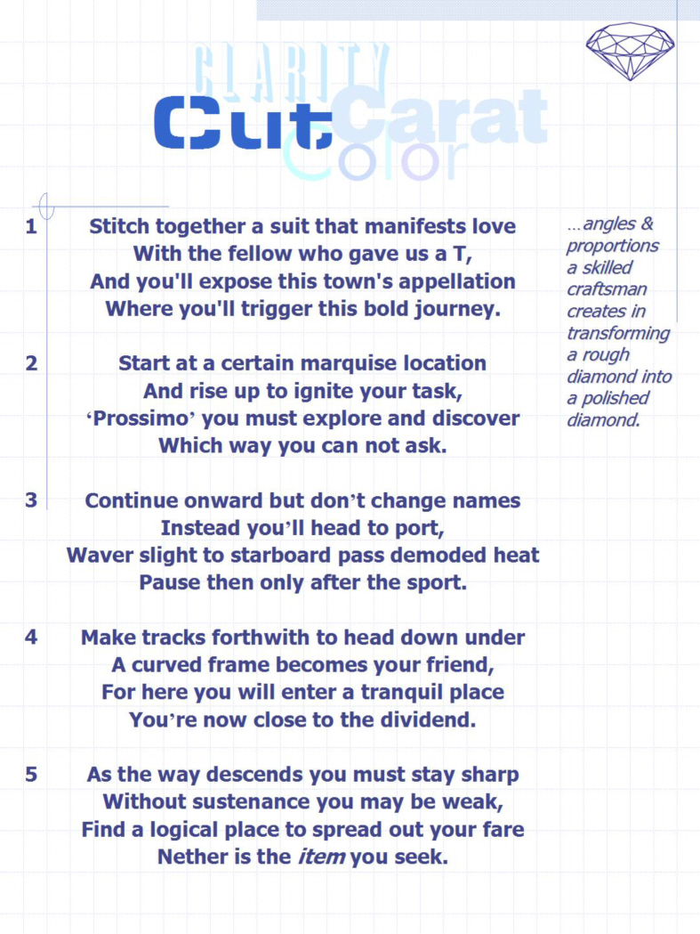 - the solution to the second stanza riddle gives you the starting point within that town, with the name of the riddle (one of the 4 C's of diamonds) providing a specific hint,
